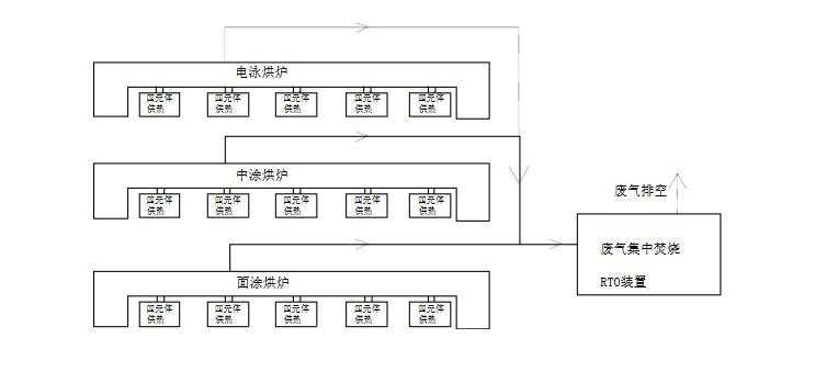 RTO系统是三个烘炉废气集中送至蓄热式,RTO焚烧炉焚烧,直接排空,废气排空温度较高。烘干室供热由四元体单独提供。
